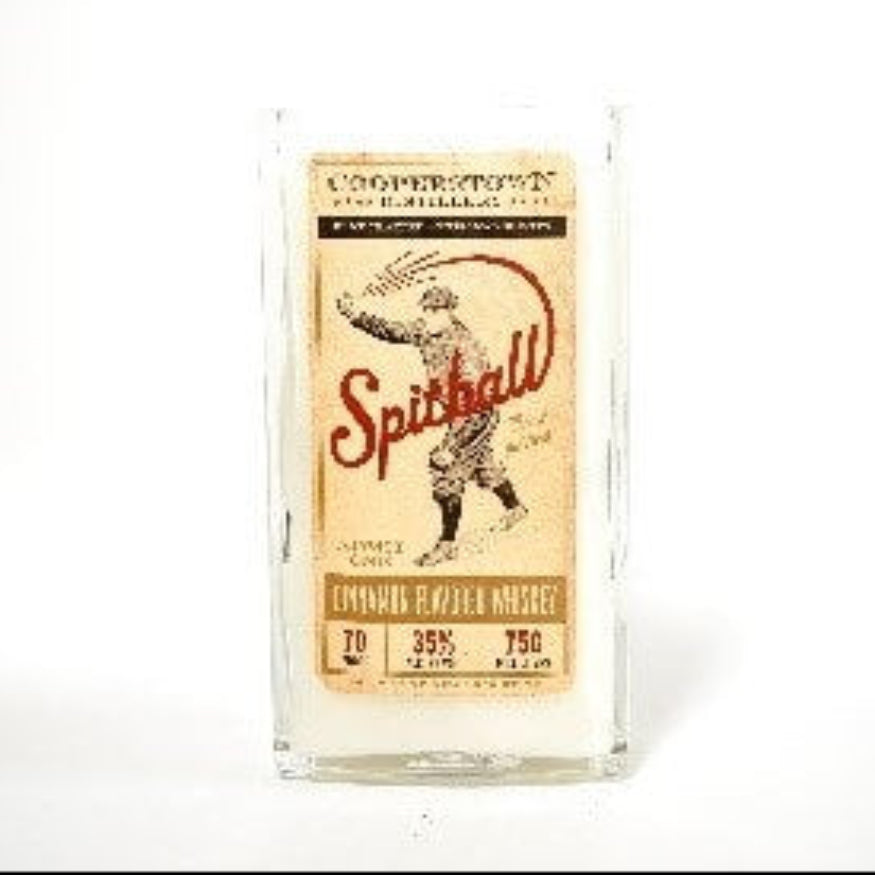 The Cooperstown Recycled Whiskey Candle – Spitball is a rectangular glass container with a vintage-style "Spitball" label, featuring a baseball player illustration and numerical details below.