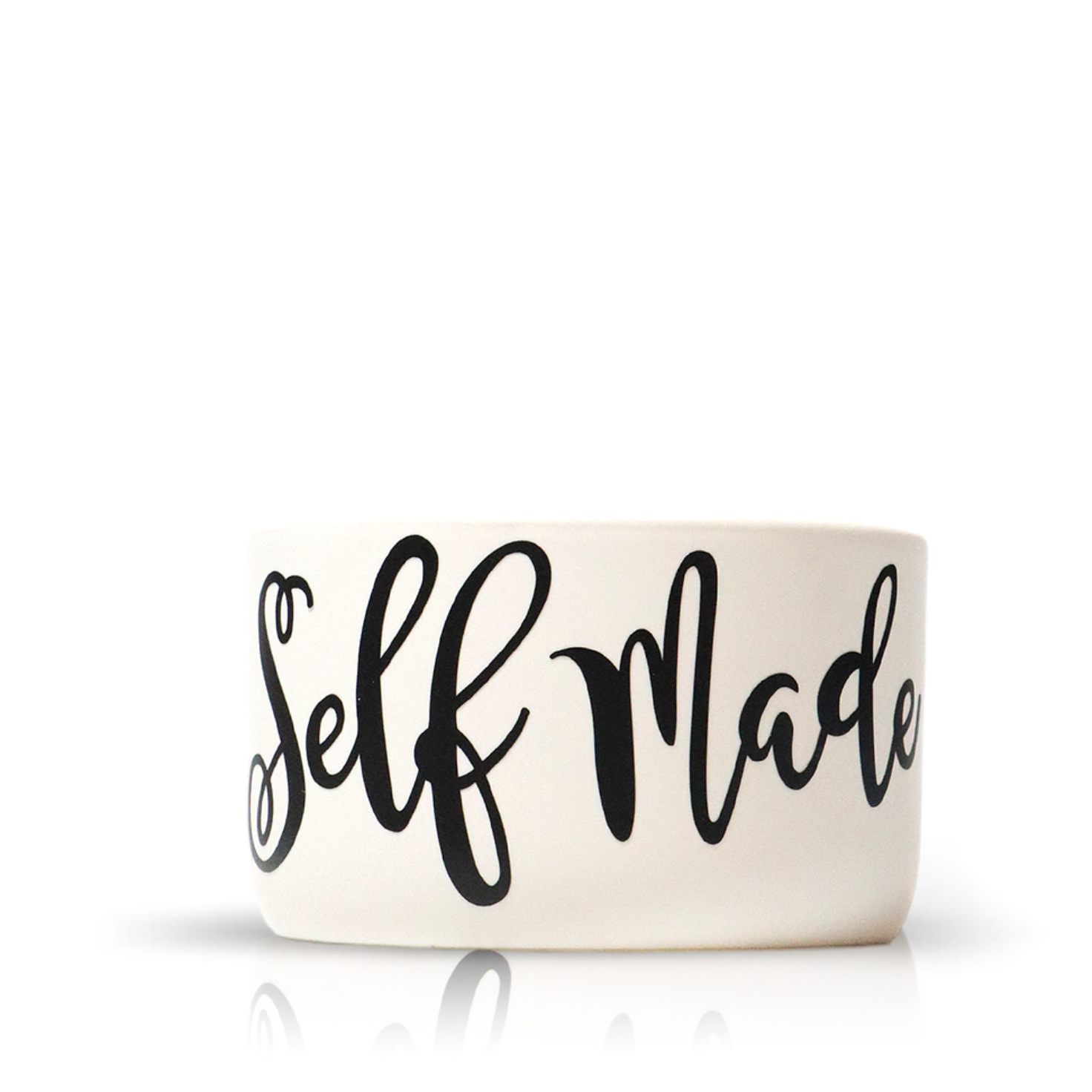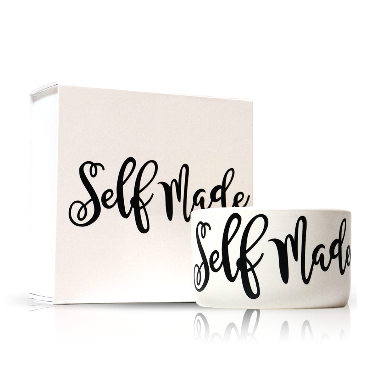 The "Self Made" White Candle Gift Box Set includes a natural wax candle and a white ceramic mug, both featuring "Self Made" in bold black script—a thoughtful, inspiring gift for any occasion.