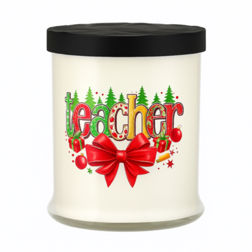The Teacher's Christmas Candle with Matches is a white candle jar with a black lid, featuring “teacher” in festive designs like trees, ornaments, and a red bow. This refillable candle makes the perfect holiday gift for teachers.