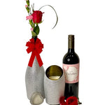 This gorgeous luxury gift set comes with a silver diamond vase and a champagne scented curve cut candle and a bottle of wine. Please note online orders will receive a artifical silk rose.